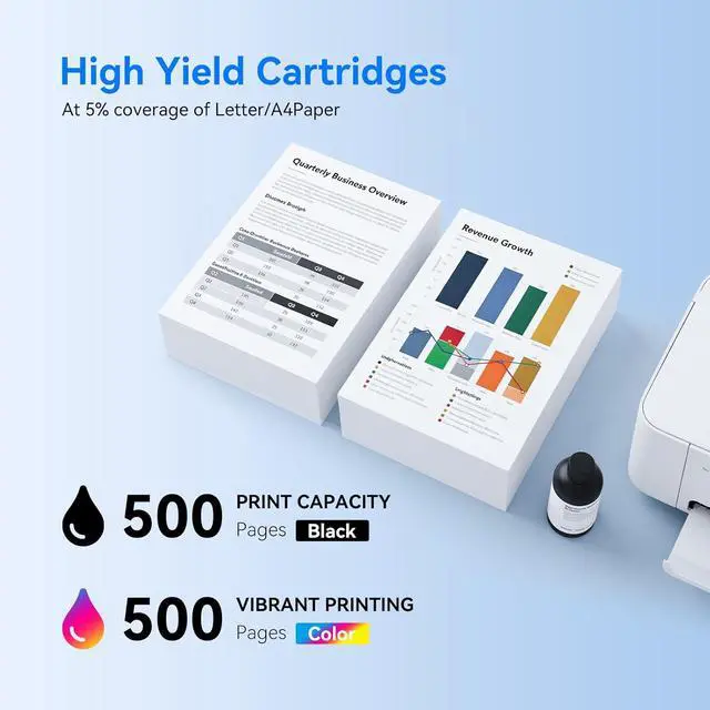 High Page Yield: Print more for less. Up to 500 pages per Black cartridge and 500 pages per Color cartridge (at 5% coverage on A4 paper), making it an ideal choice for daily home and office use