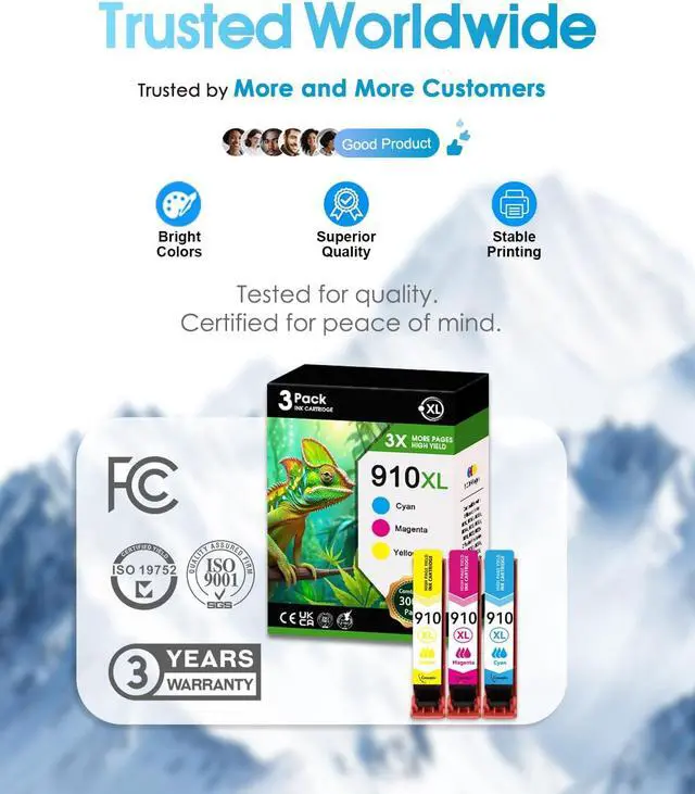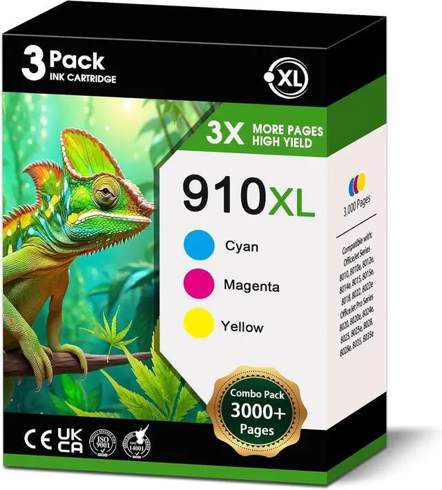 Package Contents: 3 Pack 910XL Color Ink Cartridges(1Cyan, 1Magenta, 1Yellow)