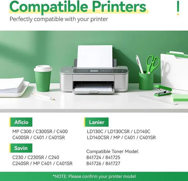 Compatible Printers: Compatible with Ricoh Aficio MP C300 C300SR C400 C400SR C401 C401SR, Ricoh Lanier LD130C LD130CSR LD140C LD140CSR MP C401 C401SR, Ricoh Savin C230 C230SR C240 C240SR MP C401 C401SR Series Printer. Compatible Toner Model841724, 841725, 841726, 841727.