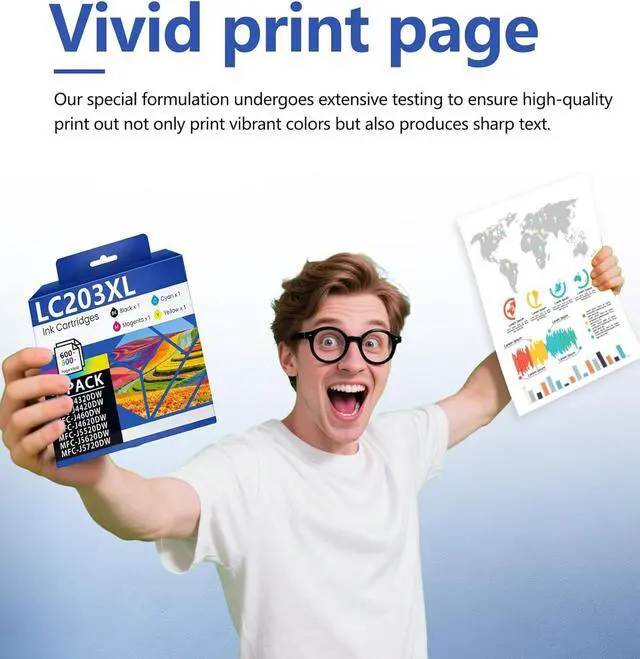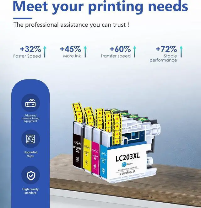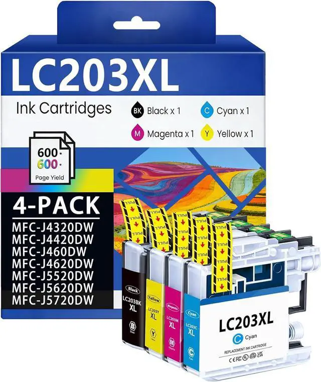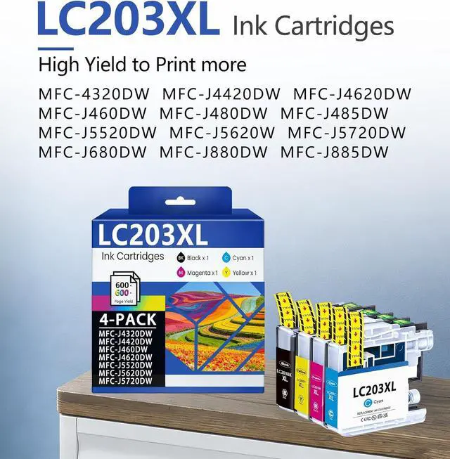 High-Capacity Ink Cartridge Pack: Contains 4 LC203XL cartridges (1Baclk, 1 Cyan, 1 Magenta, 1 Yellow). Individually sealed packaging prevents ink leakage