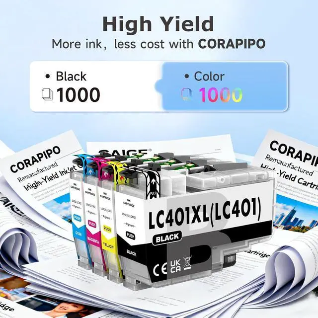 High Page Yield:LC-401XL Ink Cartridges print up to 500 pages per cartridge,500pages for LC401XL Color ink C/Y/M 401 Ink(at 5% coverage on A4 paper),you will get a 4,000 page yield ink cartridge comb pack for LC401 series( at 5% coverage of A4 paper)