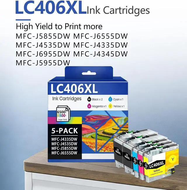 High-Capacity Ink Cartridge Pack: Contains 5 LC406XL cartridges (2Baclk, 1 Cyan, 1 Magenta, 1 Yellow). Individually sealed packaging prevents ink leakage