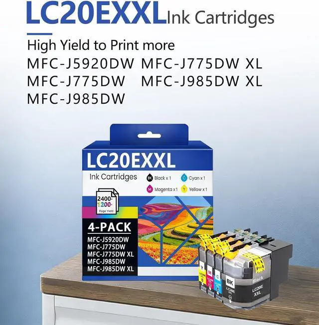 High-Capacity Ink Cartridge Pack: Contains 4 LC20EXXL cartridges (1Baclk, 1 Cyan, 1 Magenta, 1 Yellow). Individually sealed packaging prevents ink leakage