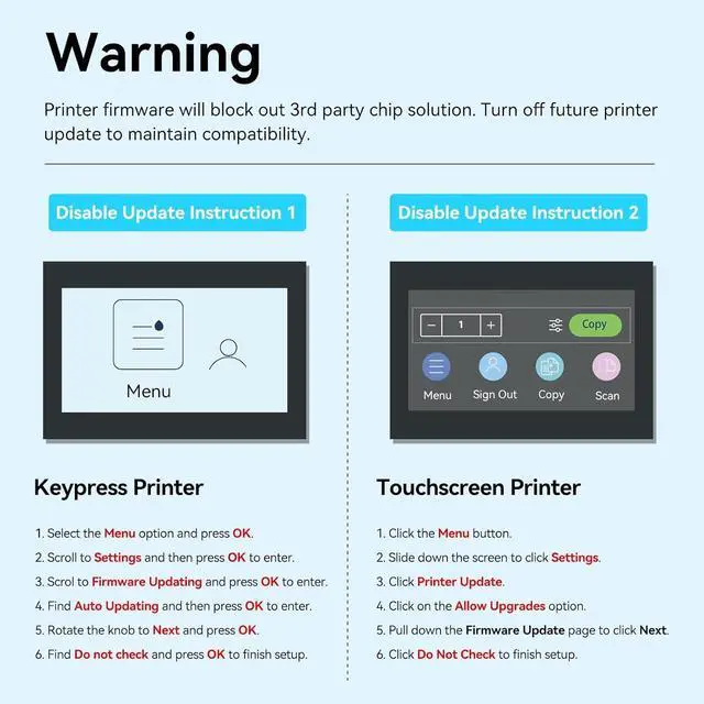 With CHIP: our 210A W2100A toner cartridges are equipped with the Latest Chips, No need to take off and install the OEM chip on 210A Toner Cartridges Set