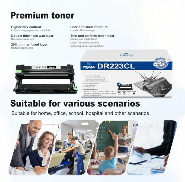 DR223CL Drum Unit come with intelligent chips that automatically recognize and provide printing, Not damaging the machine,Shake the Drum Unit horizontally 2-3 times before use to evenly distribute the toner,providing you with better clear and natural printing effects.