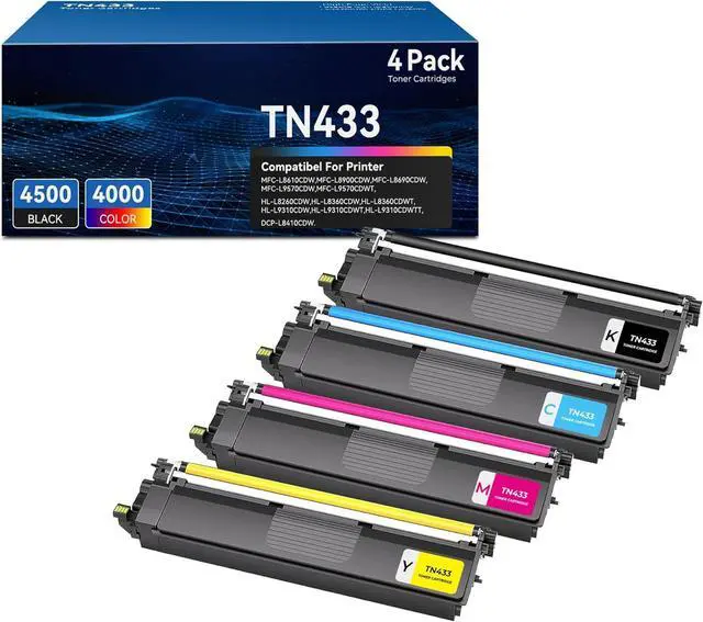 TN 433 Toner Cartridges Package Includes: 4 Pack TN-433 toner cartridges ( 1 x TN433 Black toner cartridge, 1 x TN433 Cyan toner cartridge, 1 x TN433 Magenta toner cartridge, 1 x TN433 Yellow toner cartridge).