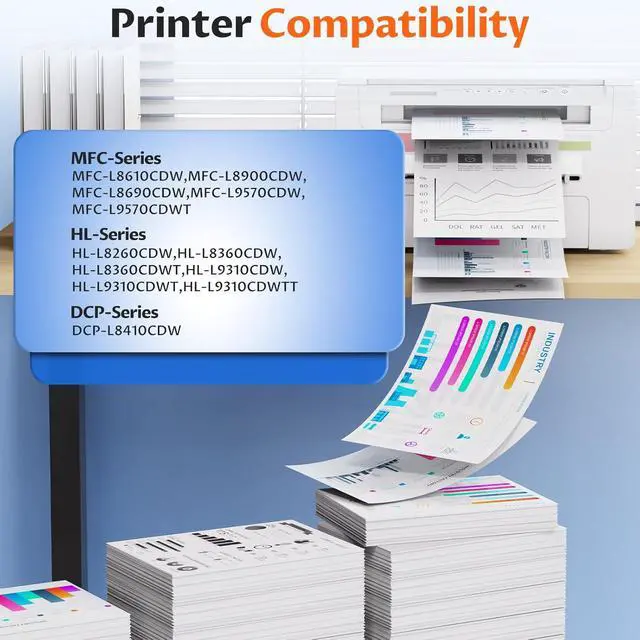 TN433 Toner Cartridge are compatible with Brother MFC-L8610CDW, MFC-L8900CDW, MFC-L8690CDW, MFC-L9570CDW, MFC-L9570CDWT, HL-L8260CDW, HL-L8360CDW, HL-L8360CDWT, HL-L9310CDW, HL-L9310CDWT, HL-L9310CDWTT, DCP-L8410CDW printers.