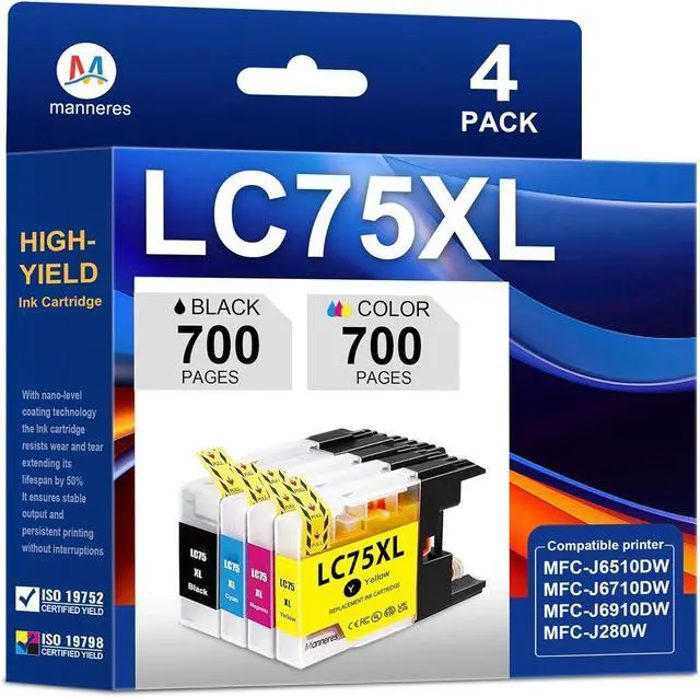 Package contents: 4 Pack-LC75XL(1Black+1Cyan+1Magenta+1Yellow) Ink Cartridges