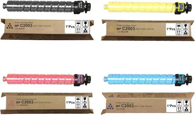 Package Contents: 4 Pack Compatible for Ricoh MP C2003 Toner Cartridges (1x Black 841918, 1x Yellow 841919, 1x Magenta 841920, 1x Cyan 841921).