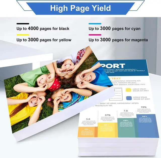 High Page Yield: Up to 4,000 pages per pack black toner, and 3,000 pages per pack color toner(cyan yellow magenta) at 5% coverage (Letter/A4)
