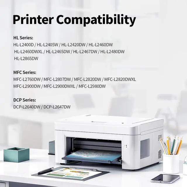 Compatible with: Brother HL-L2400D HL-L2405W HL-L2420DW HL-L2460DW HL-L2460DWXL HL-L2465DW HL-L2467DW HL-L2480DW HL-L2865DW; DCP-L2640DW DCP-L2647DW; MFC-L2760DW MFC-L2807DW MFC-L2820DW MFC-L2820DWXL MFC-L2900DW MFC-L2900DWXL MFC-L2980DW printers