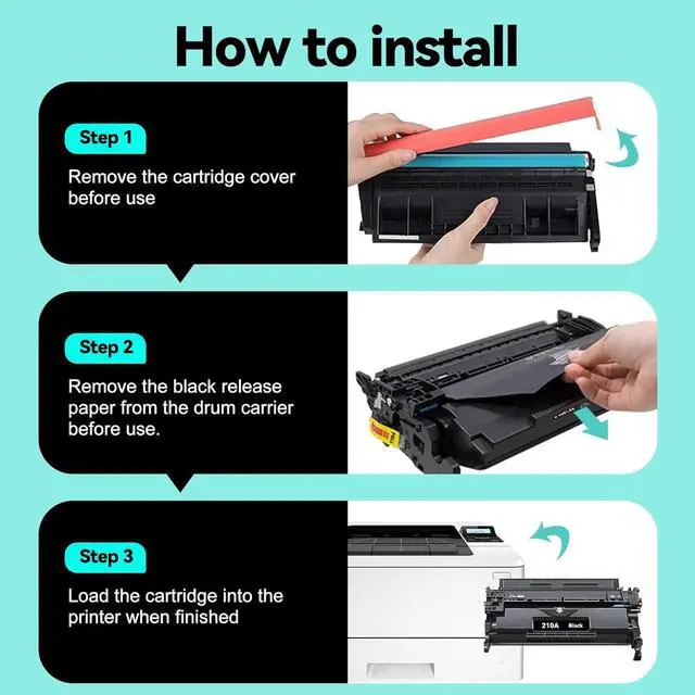 Package Contents: 4-Pack 210A W2100A Toner Cartridge with chip. Compatible with HP 210A 210X Toner Cartridges. Color: Black/Cyan/Magenta/Yellow