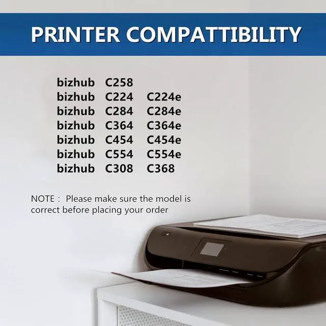 Compatible ModelsReplacement for Konica Minolta bizhub C224 C224e C258 C284 C284e C308 C364 C364e C368 C454 C454e C554 C554e printers.