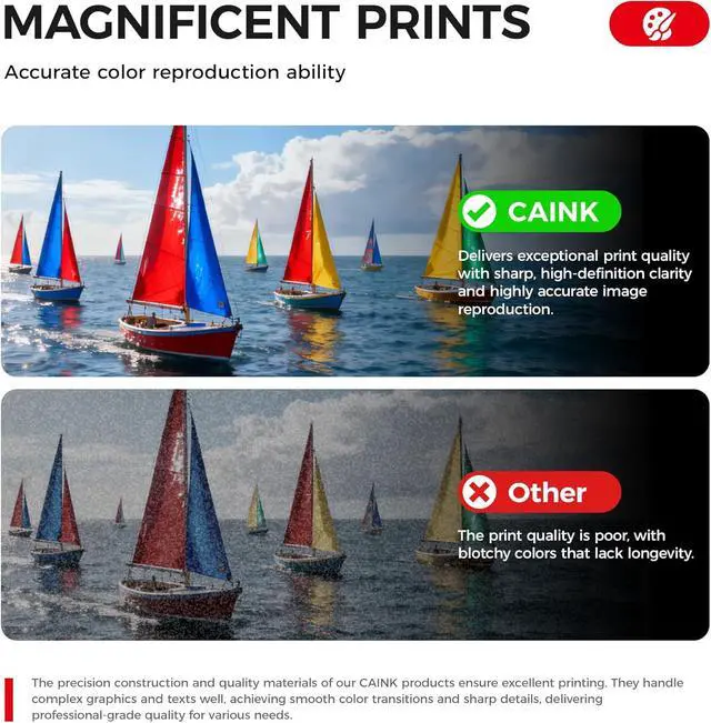 CAINK toner cartridges are ISO-9001 and ISO-14001 certified. Each toner cartridge undergoes a strict quality testing procedure, delivering excellent print quality from the first page to the last. Use our Cartridge to avoid toner leaks, premature failures or dangerous code as much as possible.