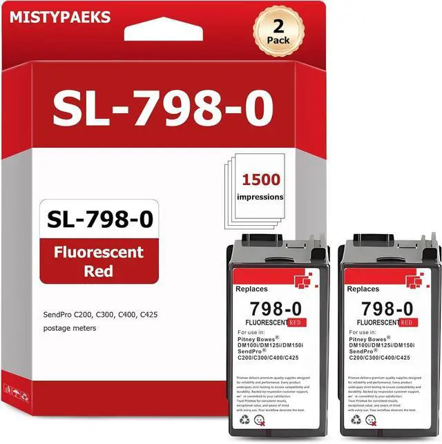Package Includes 2 Pack High-Yield Red Ink 2-Pack 35ML High Yield sl-798-0 red ink cartridge compatible for pitney bowes sl-798-0 red ink cartridge for SendPro C200, C300, C400, C425 postage meters.