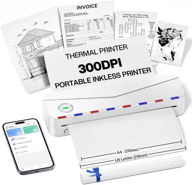 Portable thermal printer comes equipped with an adjustable clip that supports various thermal paper sizes, including US Letter (8.5 x 11 inches) and A4 (8.27 x 11.69 inches) thermal paper, as well as 2.08", 3.14", and 4.33 widths. The inkless portable printer also supports three types of paper: thermal paper, roll thermal paper, and folded thermal paper