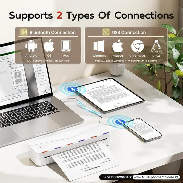 Portable Printer Wireless: Phomemo portable design allows you to print wherevery you stay, providing convenience and freedom wherever you go. Whether you're traveling or at home, office, Phomemo M836 Thermal Printer is your perfect companion