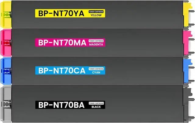 Package includes: 1 x BP-NT70BA black toner cartridge, 1 x BP-NT70CA cyan toner cartridge, 1 x BP-NT70MA magenta toner cartridge, 1 x BP-NT70YA yellow toner cartridge replacement for Sharp BP-NT70 toner cartridge, BPNT70 toner cartridge.