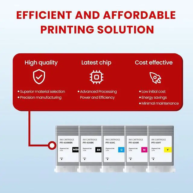 Smart chip technology: PFI030 Ink cartridge with smart chip enables instant auto-recognition and full compatibility. Its plug-and-play design eliminates setup hassles, delivering seamless office productivity