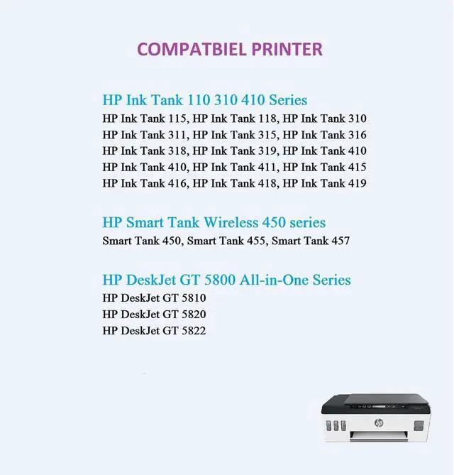 Compatible Printer: HP Ink Tank 110, HP Ink Tank 115, HP Ink Tank 118, HP Ink Tank 310, HP Ink Tank 311, HP Ink Tank 315, HP Ink Tank 316, HP Ink Tank 318, HP Ink Tank 319, HP Ink Tank 410, HP Ink Tank 411, HP Ink Tank 415, HP Ink Tank 416, HP Ink Tank 418, HP Ink Tank 419