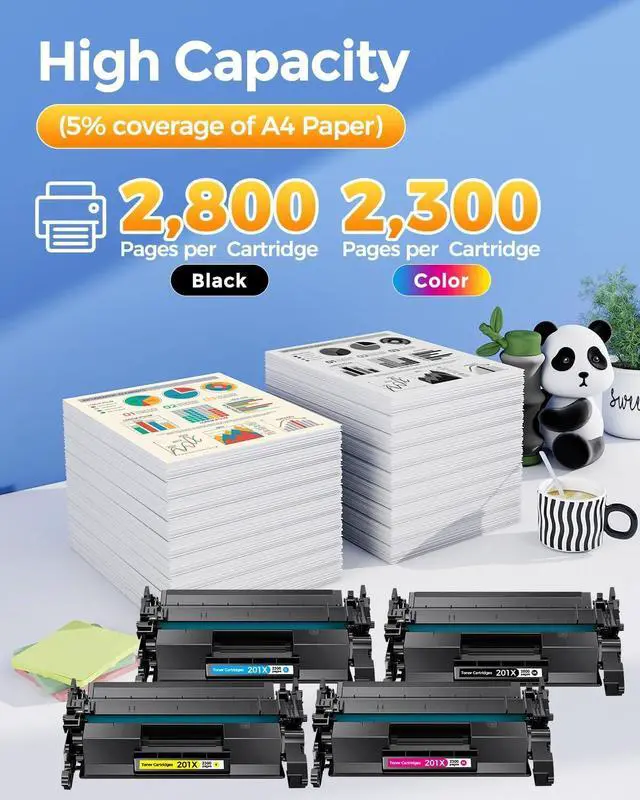 High Page Yield: Up to 2,800 pages per 201X CF400X black toner, Up to 2,300 pages per 201X color toner (Base on Letter A4, at 5% coverage).