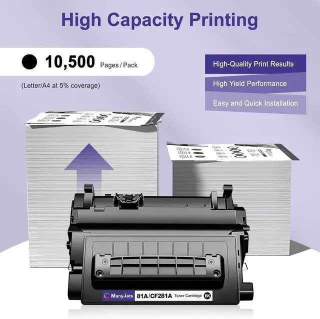 High Page Yield: Each CF281A black toner cartridge replacement for HP 81A Black Toner Cartridge produces up to 10,500-Page Yield Get sharp text and vibrant colors for professional results every time. (Based on 5% coverage, A4/Letter size)