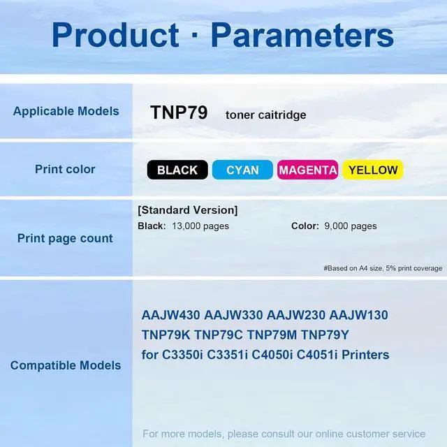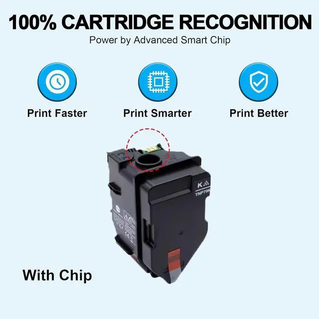 With Chip The TNP79K TNP79C TNP79M TNP79Y toner cartridge is equipped with an chip that printer proactively monitors page count and toner levels