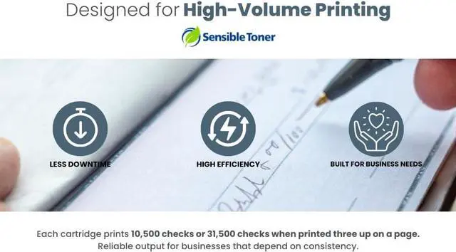 This cartridge prints 10,500 checks one up to a page, or 31,500 checks three up on a page. This cartridge is for dedicated check printing applications like payroll and generating accounts payable checks.