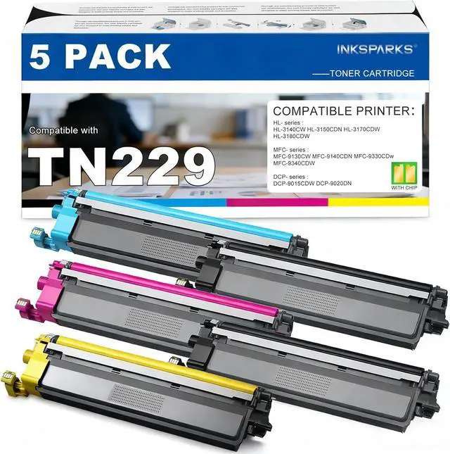 COMPLETE 5-PACK SET: Includes 2 Black, 1 Cyan, 1 Magenta, and 1 Yellow TN229 standard-yield toner cartridges with chips for seamless installation and accurate toner level monitoring