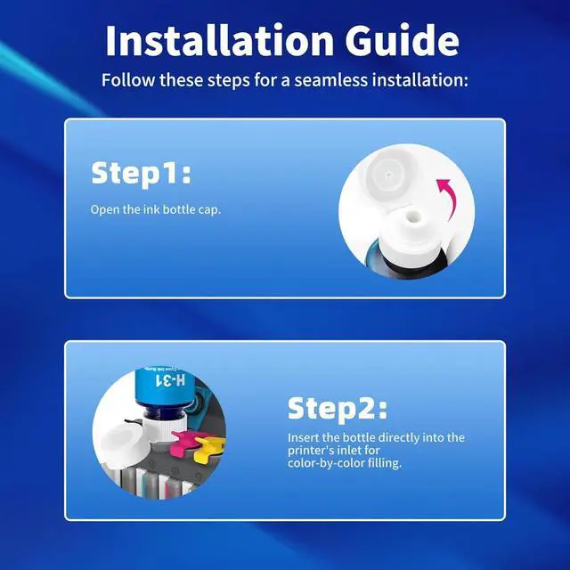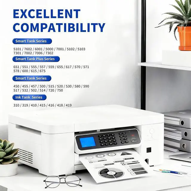 Compatible Printers: Smart Tank 5101 7602 6001 5000 7001 5102 5103 7301 7002 7006 7302 printers. And for Smart Tank Plus 651 551 555 557 559 655 617 570 571 578 600 615 675 printers. Also for Smart Tank 450 455 457 500 515 520 530 580 590 517 532 502 514 720 750 and Ink Tank 310 319 410 415 416 418 419 printers
