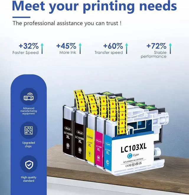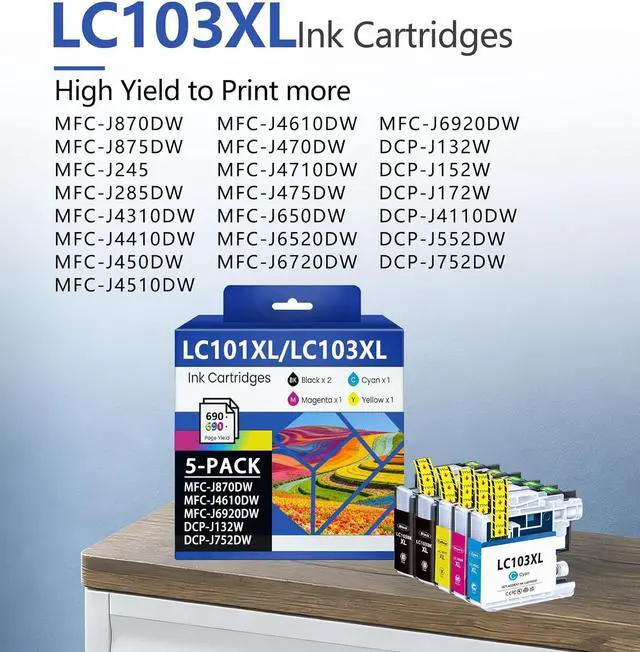 High-Capacity Ink Cartridge Pack: Contains 5 LC103XL cartridges (2Baclk, 1 Cyan, 1 Magenta, 1 Yellow). Individually sealed packaging prevents ink leakage