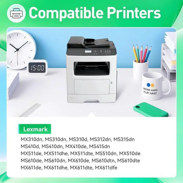 Compatible Printers: Compatible with Lexmark MX310MS310MS312MS315MS410MX410MS415MX511MS510MX510MS610MX611 MX310dnMS310dnMS310dMS312dnMS315dnMS410dMS410dnMX410deMS415dnMX511deMX511dheMX511dteMS510dnMX510deMS610deMS610dnMX610deMS610dtnMS610dteMX611deMX611dheMX611dteMX611dfe Series Printer.