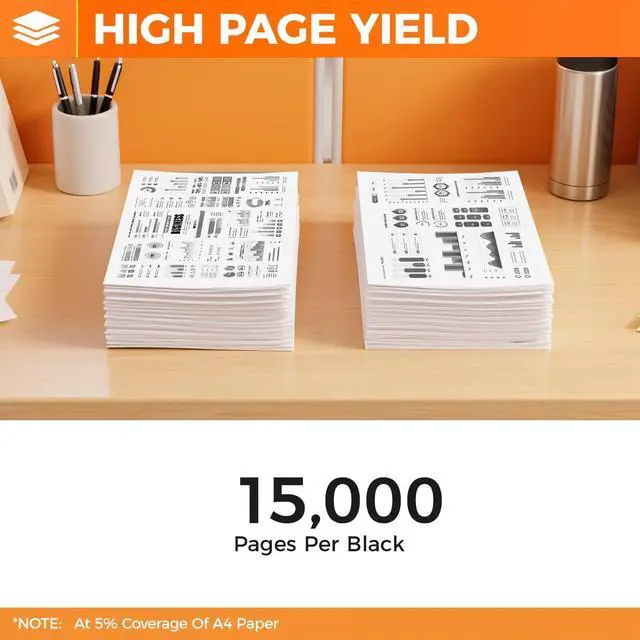 High Page Yield: Each black 15000 pages at 5% Coverage (A4)