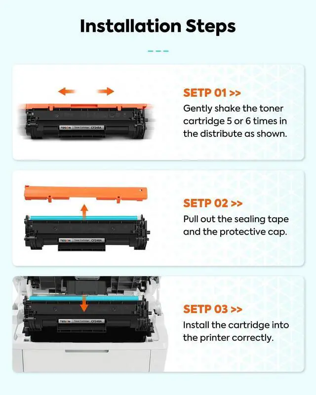 Package Includes4 packs TESEN compatible CF248A black toner cartridges (with newest chip) and an installation specification