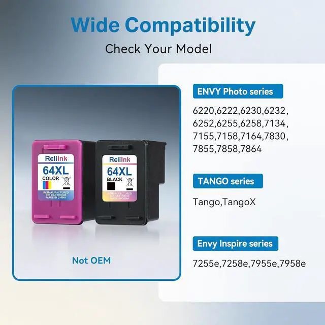 Wide Printer Compatibility: ReliInk for hp 64 xl ink cartridges black/color combo pack is compatible with many printers, including HP Envy Photo 6220 6222 6230 6232 6252 6255 6258 7134 7155 7158 7164 7830 7855 7858 7864 Inspire 7255e 7258e 7955e 7958e Tango TangoX. Whether youre printing at home, in a business, or for school project, these for hp 64 black ink cartridge and hp 64 color ink cartridges deliver consistent quality and smooth operation.