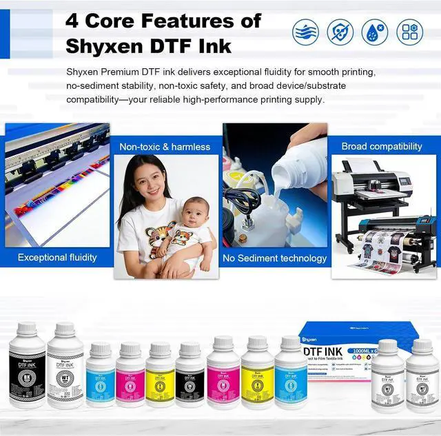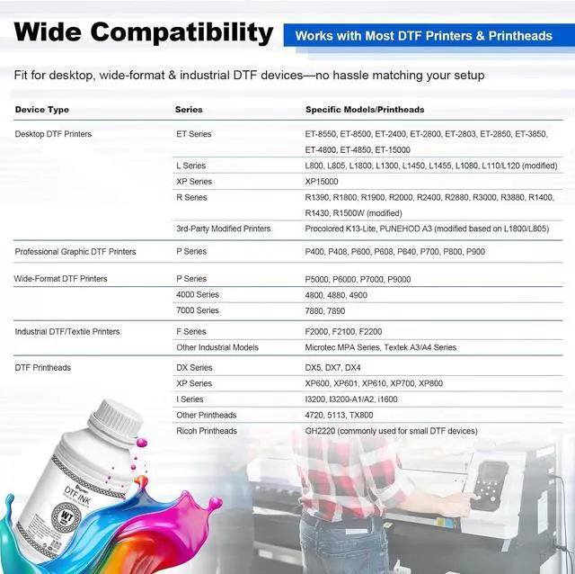 Wide Compatibility Works seamlessly with DTF printers including XP-15000, L1800, L805, R1390, R2400, XP600, I3200, DX5, DX7, and other 6/8-color models. Work with SHYXEN DTF transfer film and DTF powder.