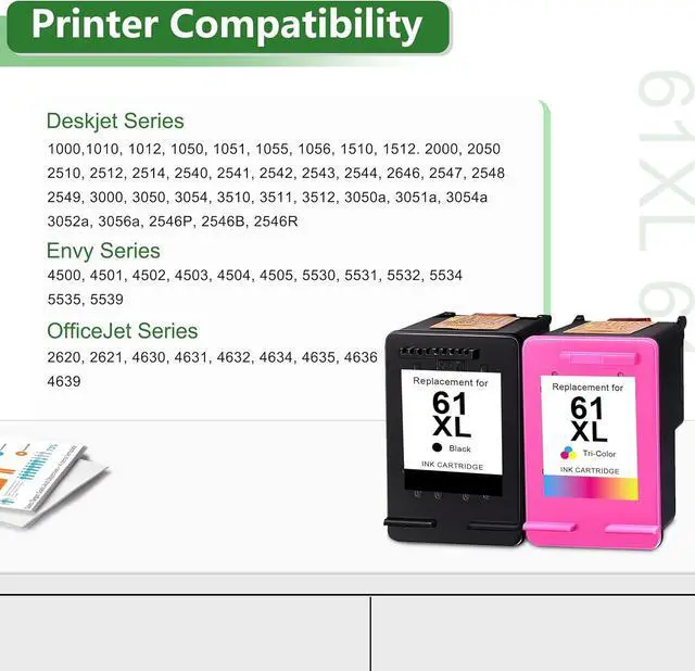Compatible Printers: 61xl Ink Cartridges Combo Pack work for Envy 4500 4501 4502 4503 4504 4505 Series, Envy 5530 5531 5532 5534 5535 5539 Series, OfficeJet 2620 2621 4630 4632 4634 4635 Series, DeskJet 1000 1010 1012 1050 1051 1055 Series, DeskJet 1056 1510 1512 2000 2050 2510 Series, DeskJet 2512 2514 2540 2541 2542 2543 Series, DeskJet 2544 2646 2547 2548 2549 3000 Series, DeskJet 3050 3054 3510 3511 3512 Series, DeskJet 3050a 3051a 3054a 3052a 3056a, DeskJet 2546P 2546B 2546R Series Printer