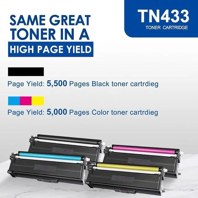 Page Yield: 5,500 Pages per TN433 Black toner cartridge & 5,000 Pages per TN433 Color toner cartridge, based on 5% coverage