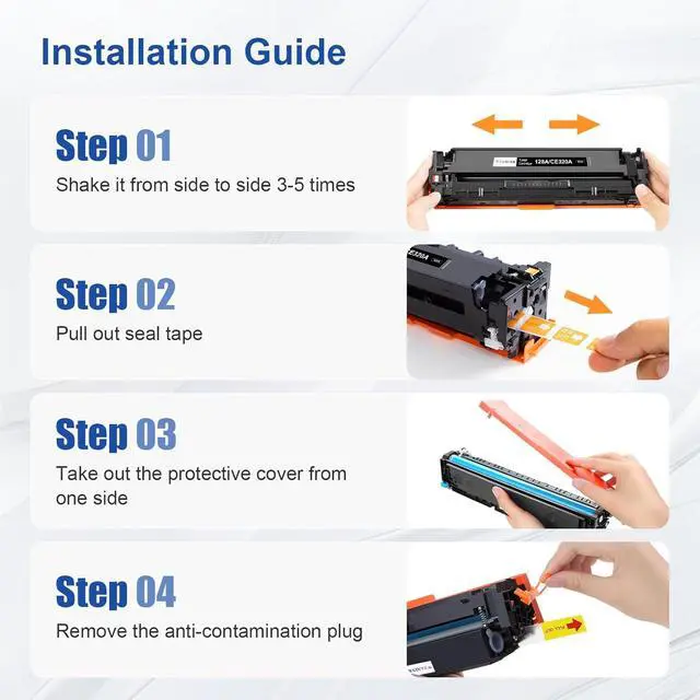 Package Includes: 1 pack CE320A Black, 1 pack CE321A Cyan, 1 pack CE322A Yellow, 1 pack CE323A Magenta Toner Cartridges