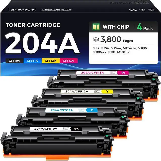 Package Contains: 4 Packs toner cartridges (204A CF510A Black / 204A CF511A Cyan / 204A CF512A Yellow / 204A CF513A Magenta).