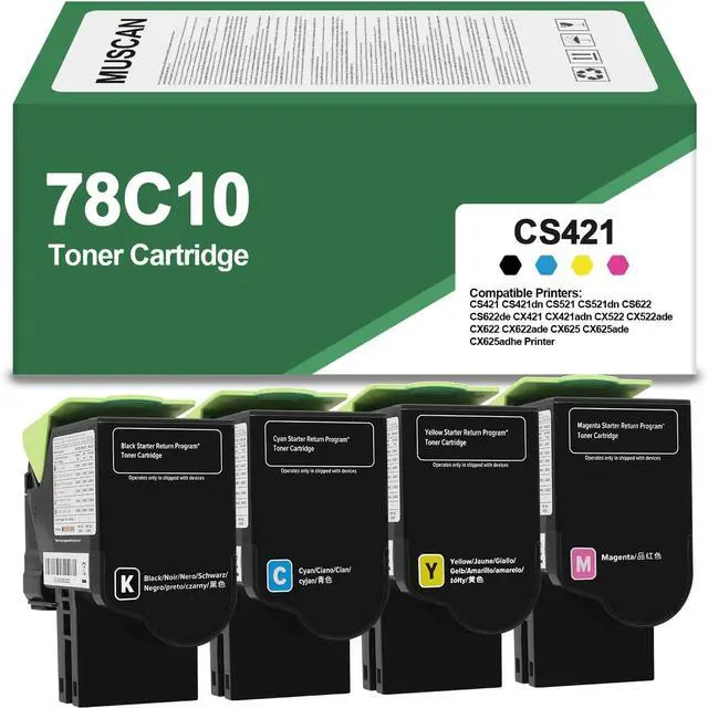 The MUSCAN CS421 78C10 Toner Cartridge 78C10K0 78C10C0 78C10M0 78C10Y0 Replacement for CS421 CX421 CS421DN CS521 CX521 CS521DN CS522 CX522 CS522DE CS622 CX622 CS622DE CX625 CX625DE Printer(4-Pack) offers high-quality printing with a page yield of 2000 pages per black toner and 1400 pages per color toner at 5% coverage of A4 Letter. It is compatible with a range of printers and comes with a brand new chip for seamless recognition by the machine.