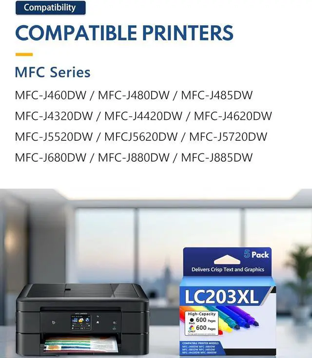 Wide Compatibility : LC203XL ink cartridges Compatible with Compatible with Brother MFC-4320DW MFC-J4420DW MFC-J4620DW MFC-J460DW MFC-J480DW MFC-J485DW MFC-J5520DW MFC-J5620W MFC-J5720DW MFC-J680DW MFC-J880DW MFC-J885DW Printer