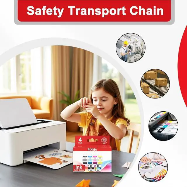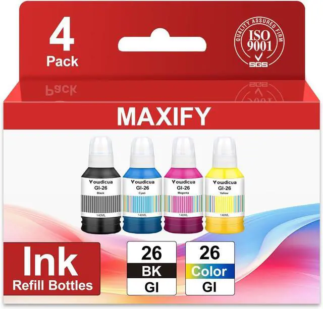 Package Contents:GI-26 Ink Refill Bottles(4-Pack Black Cyan Magenta Yellow) GI26 Pigment Black Ink refill 170ML,GI26 Pigment( C,M,Y) Ink refill 135m