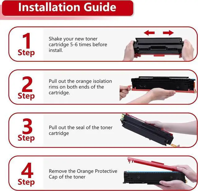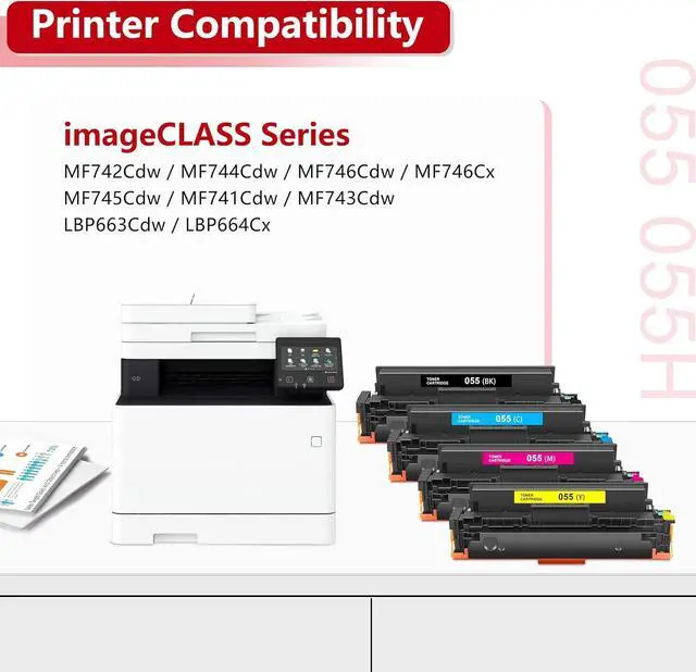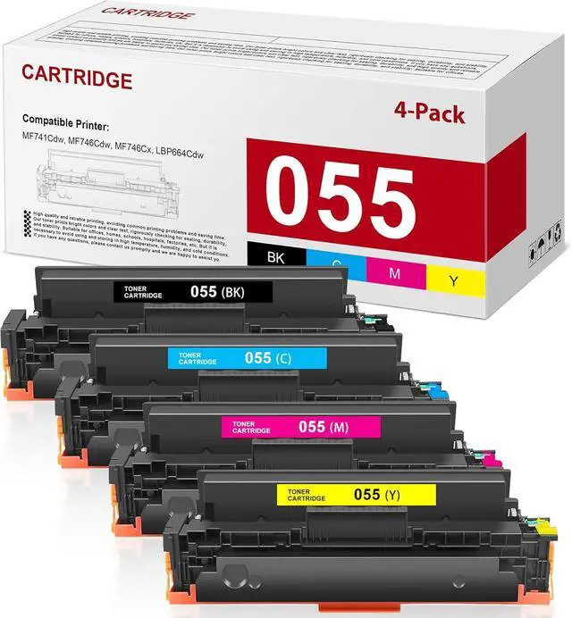Included in the package: 1 x 055 Black toner cartridge, 1 x 055 Cyan toner cartridge, 1 x 055 Magenta toner cartridge, 1 x 055 Yellow Toner Cartridge, total 4 pack 055 toner cartridges standard yield replacement for Canon cartridge 055 toner