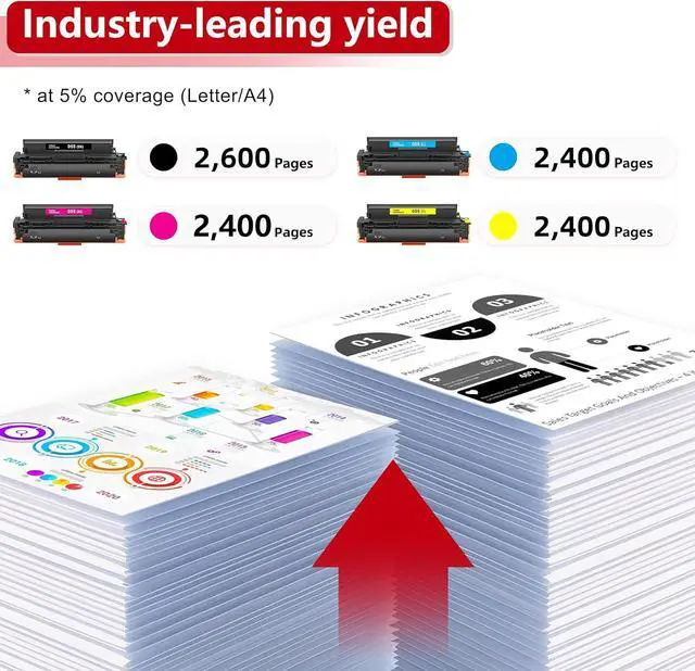 Cost-Effective Page Yield: 2,600 Pages per 055 Black toner cartridge 2,400 Pages per 055 Color toner cartridge at 5% coverage