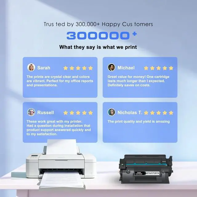 Multiple printed pages: Up to 9,000 pages per Black 87A Toner Cartridges (5% coverage/A4 paper)