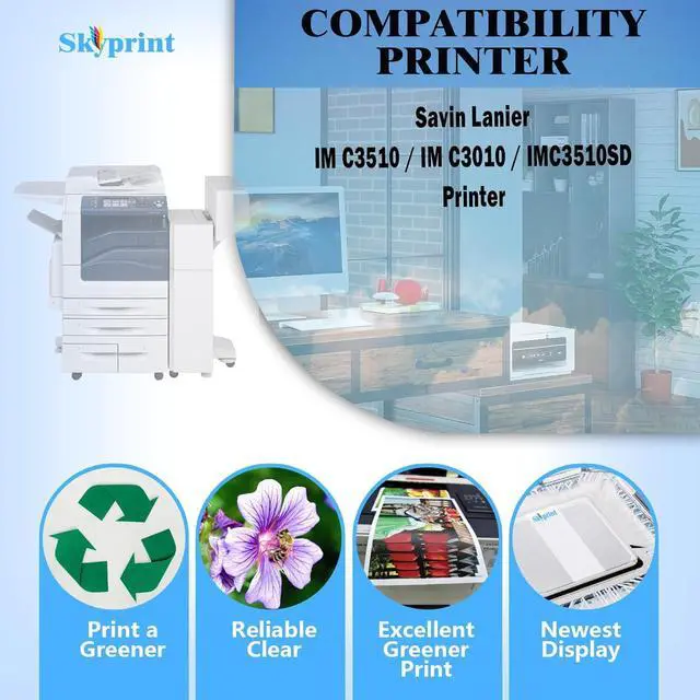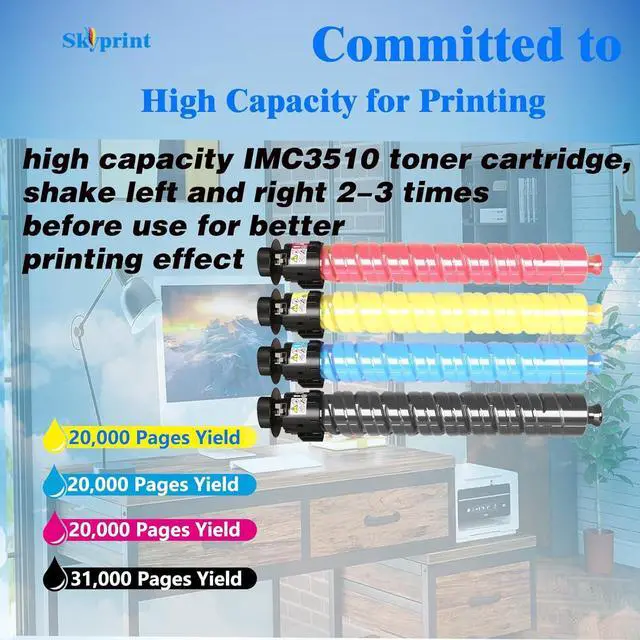 SkyPrint IMC3510 toner cartridges come with intelligent chips that automatically recognize and provide printing , Not damaging the machine,Shake the toner cartridge horizontally 2-3 times before use to evenly distribute the toner,providing you with better clear and natural printing effects