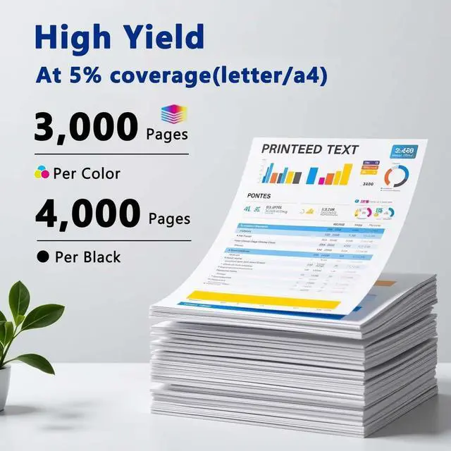 High Page Yiled: 4,400 pages per Black cartridge and 3,000 pages per Cyan Yellow Magenta Cartridge at 5% coverage (Letter/A4)