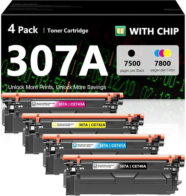 What's in the Box: 4-Pack 307A toner cartridges set (1 Black 307A CE740A , 1 Cyan 307A CE741A , 1 Yellow 307A CE742A , 1 Magenta 307A CE743A)
