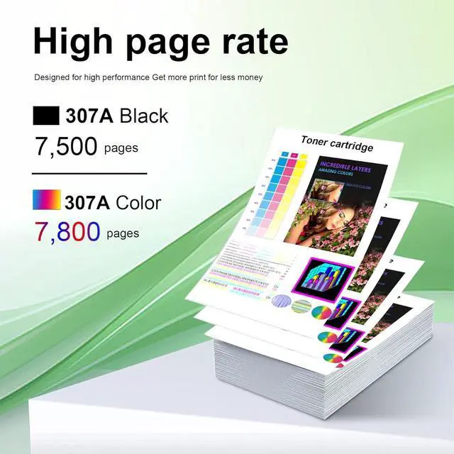 Cartridge Yield (Approx.): Up to 7,500 pages for 307A black toner and 7,800 pages for each 307A color toner at 5% coverage (Letter/A4)
